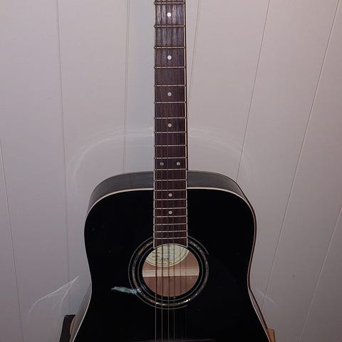 Akustisk gitar med tradisjonelt design og trefinish selges da blir ikke brukt lenger.