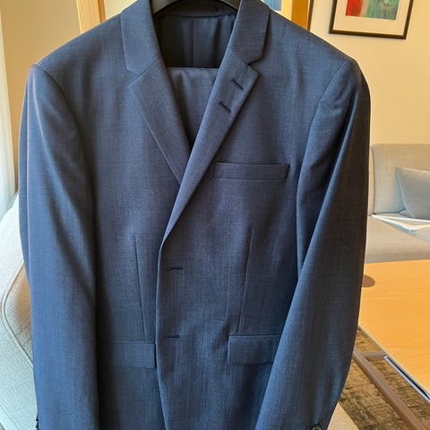 Blazeren er størrelse 48, buksen er størrelse 50. Medfølger også en grå vest i størrelse Large med dressen, som er kjøpt på Dressmann.