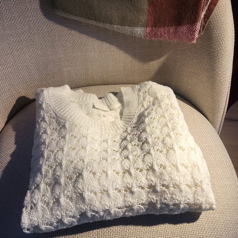 70% polyester, 11% akryl, 11% mohair og 8% nylon. Passer som pen julegenser!