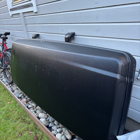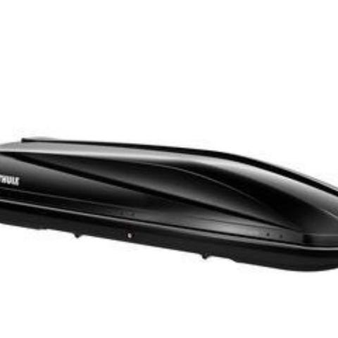 Selger en svart Thule Dynamic 900, kjent for sitt slanke og sportslige design, men med god plass. Boksen er romslig, aerodynamisk og støysvak i fart.