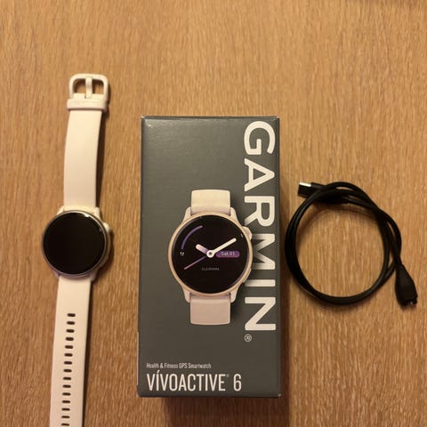 Garmin Vivoactive 6 smartklokke i hvit farge. Klokken har en rund skjerm og er egnet for bruk på håndleddet. Modellen støtter flere språkvalg, inkludert norsk og polsk.