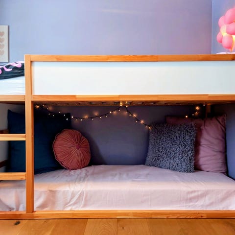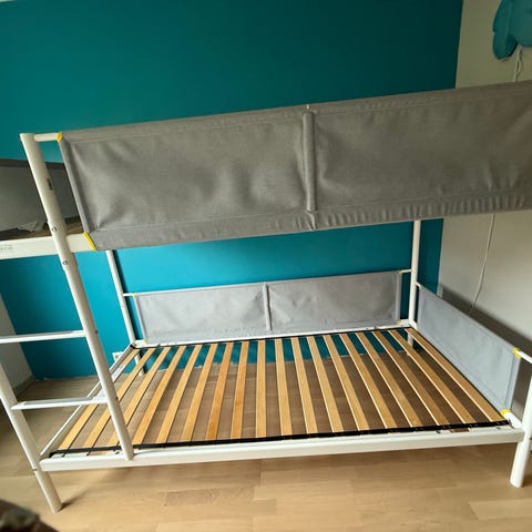 IKEA køyeseng i hvit farge, designet for barn. Sengen har to nivåer med plass til madrasser, og er laget i materialer egnet for barnemøbler. Passer for rom med behov for plassbesparende løsninger.