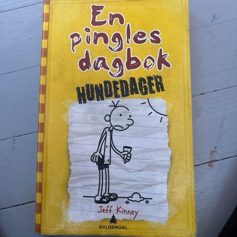 Jeff Kinney En pingles dagbok Hundedager er en bok med gul innbinding. Den tilhører serien En pingles dagbok og er skrevet på norsk.