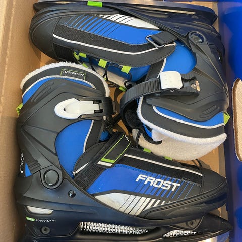 Frost Ishockey skøyter for barn i størrelse 37 -39. Skøytene har justerbar lukking og er designet for ishockeybruk. Kr 250 per par.