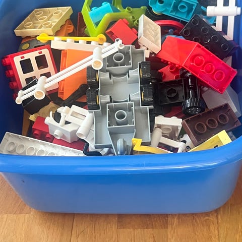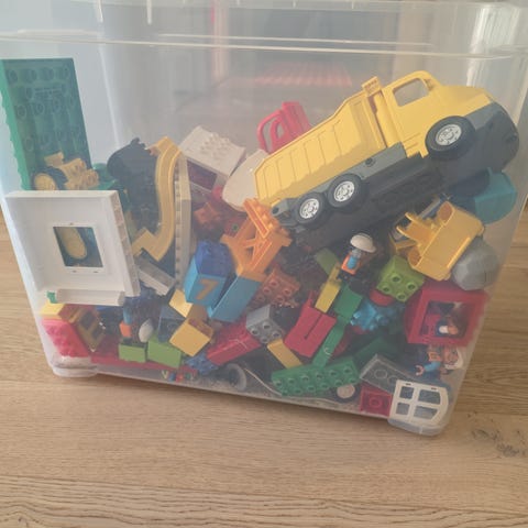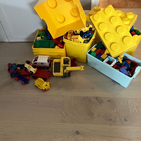 LEGO DUPLO byggeklosser med ulike deler og kjøretøy.