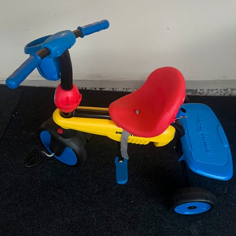 Trehjulssykkel med håndtak for voksenkontroll. Egnet for små barn, designet for enkel manøvrering og stabilitet. Godt brukt, men fungerer helt som den skal.