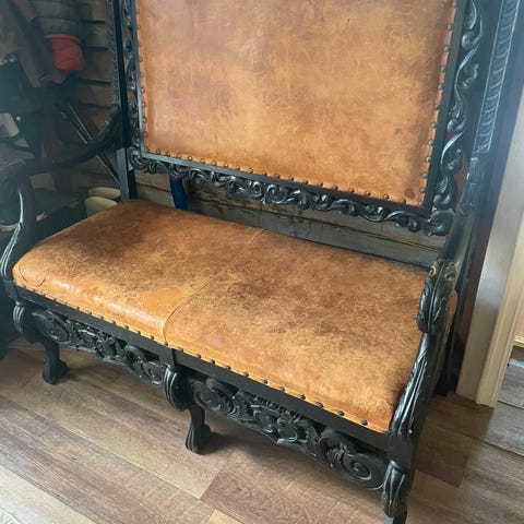 Komplett orientalsk salongmøblement i mørkt edeltre, rikt dekorert med håndlagt perlemorsinnlegg. Består av benk, flere lenestoler, salongbord og krakker. Trolig Sør-Kina, ca. 1880–1930.