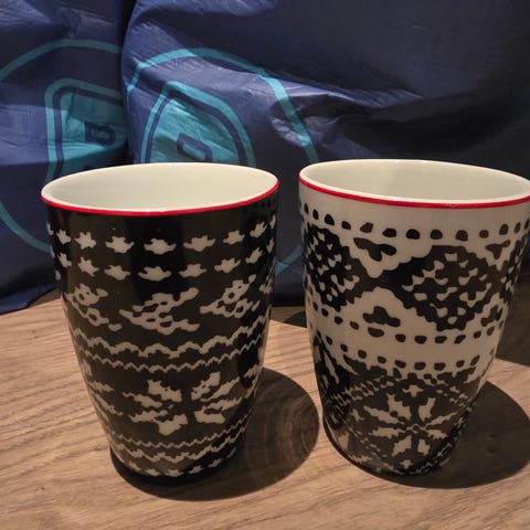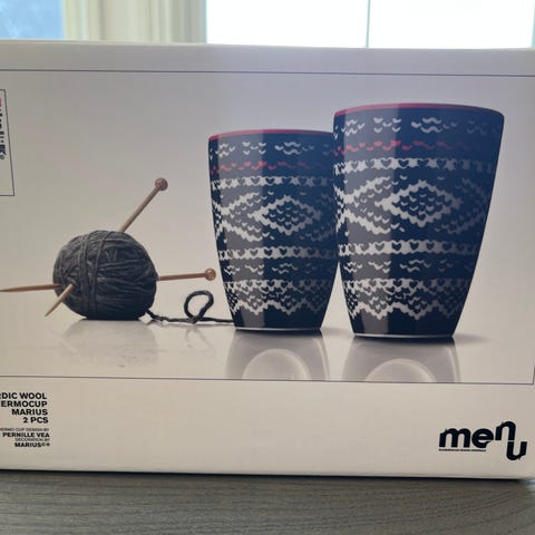 Selger 2 stk. kopper (termokopper) fra Menu, med strikkemønster og navn NORWAY. Koppene er 11 cm høye og 8 cm i diameter. Perfekt stand. Ingen tegn til bruk. 200 kr samlet. Kan hentes (Grünerløkka eller Sentrum) eller sendes.