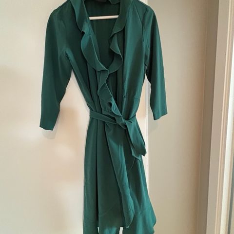 Selected Femme penkjole i grønn farge, størrelse 40. Laget i 100% polyester. Kjolen har lange ermer med knapper ved mansjettene og et omslag med knyting i livet. Den kan vaskes i vaskemaskin på 30 grader.