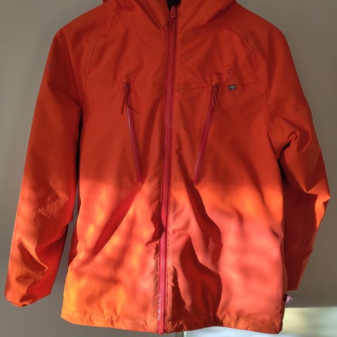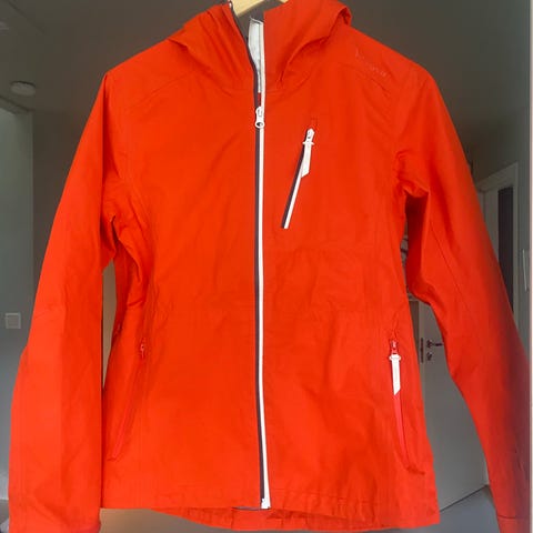Skogstad barnejakke i størrelse 122 for jente. Jakken er rød og laget av nylon. Den har hette og glidelås foran. Materialet består av 95% nylon og 5% elastan, med fôr og fyll av polyester og elastan.