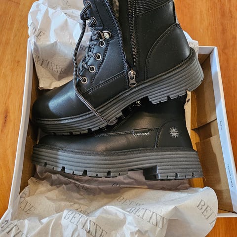 Myk og varm pusete skinn i både såle og "reimer". Slip-in. Tøfler, men elegante. Lite brukt.Ny pris 799,-