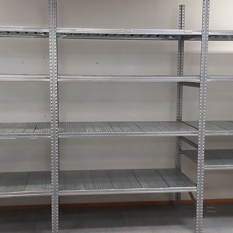 lagerreoler i metall med flere nivåer og justerbare hyller. Reolene er egnet for lagring av tunge varer i verksteder eller lagerlokaler. Designet for å maksimere lagringskapasiteten og gi enkel tilgang til lagrede gjenstander.