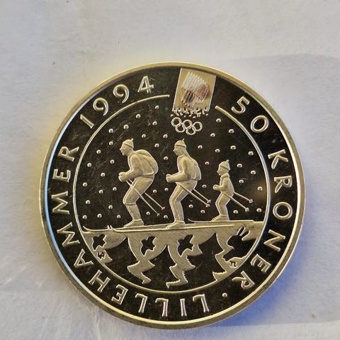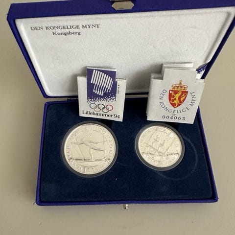 Norges kongehus Minnemyntsett bestående av to mynter på 50 og 100 kroner fra 1994. Myntene er laget i metall og kommer i et originalt oppbevaringsetui med offisielt emblem. Motiver inkluderer kongeportrett og symboler knyttet til Norges kongehus..Sender ikke til utlandet .porto kr 58