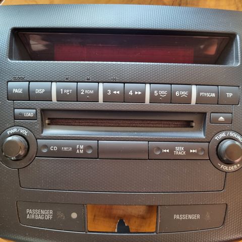 Mitsubishi Electric DY-6MN7U59-3 bilradio med CD-spiller. Enhet med flere funksjoner for bilunderholdning, produsert i Japan. Inngangsspenning 12V.