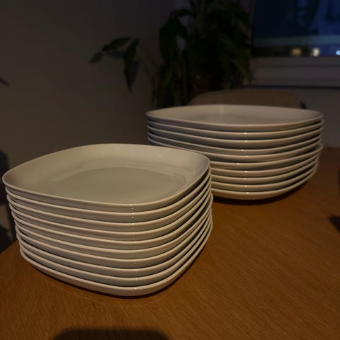 IKEA hvit keramisk servise sett bestående av firkantede tallerkener og boller. Settet inkluderer to størrelser på tallerkener, egnet for daglig bruk i kjøkken og spisestue. Noe skår i et par av tallerkner og boller.
