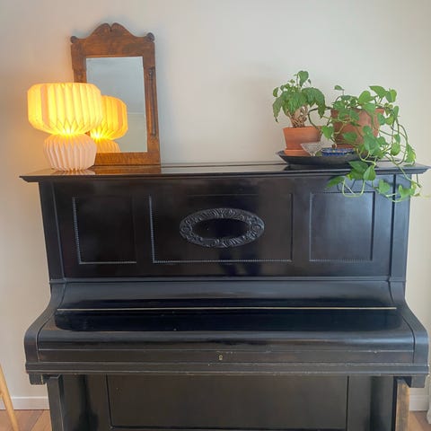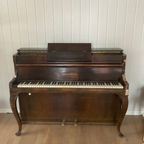 Piano fra Fuch & Möch. Det har ingen ødelagte deler så vidt jeg vet, men det er ikke stemt på tiår og høres ut der etter :)
