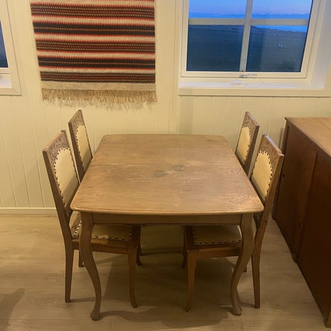 3 Stoler og benk selges. (Ikke bord) pent brukt. Kjempe goe å sitte i. Selges pga. Litt liten plass.
