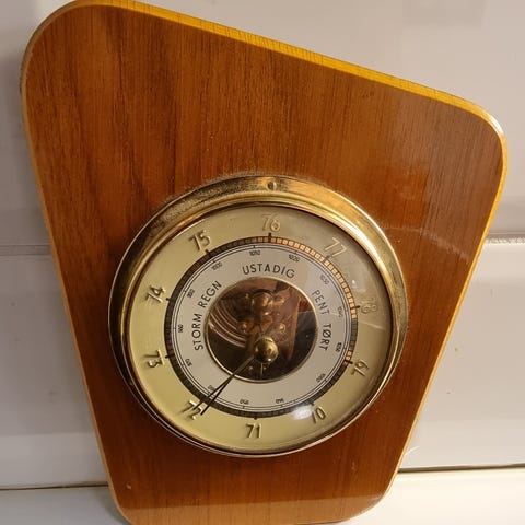 Dette er et veggmontert værinstrument – typisk en kombinasjon av barometer, termometer og hygrometer i mørkbeiset tre med messingdetaljer.