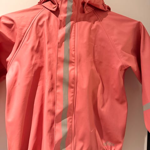 Pent brukt. Fint og godt regntøy, som tåler en del vær. Noe bruksmerker, men ingen feil. Jakka er veldig fresh, mens nederst på føttene er det noe mer synlig at den er brukt, men mulig mye vil gå av i vask. Merk, strikker til under fot mangler.