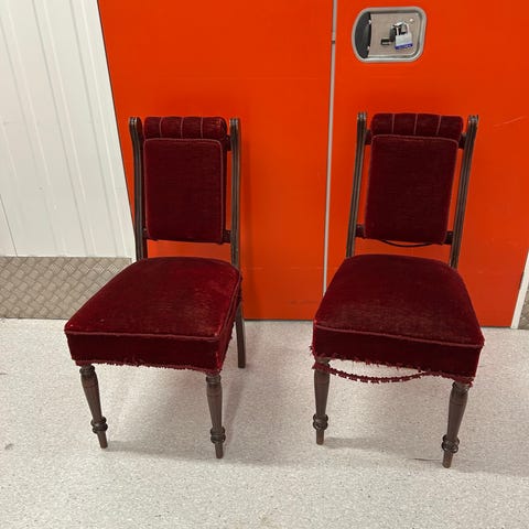 Antikke stoler i tre til salgs. Meget solide. Trekke kan enkelt skiftes, sete er kun til å vippe ut. 250 kr per stykk. 1 stol har et lite hakk. Veldig enkelt å reparere. Se bildet. 450 kr stykket