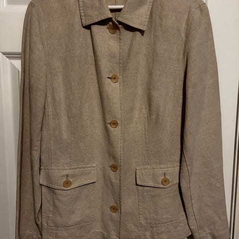Jakken er i bomull med polyester for. Jeg tenker den er i str 38-40. Nydelige kobberknapper. Jakken er nyvasket.