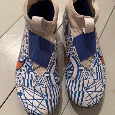 Adidas Messi fotballsko til barn i størrelse 31. Skoene er sølvfarget med lyseblå detaljer og har snøring.