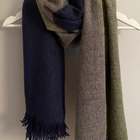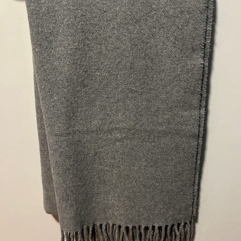 COS mørkeblått ullskjerf. 60 cm x 200 cm. Lappen er tatt av men det er 100% ull veldig finmasket strikket, med små strikkede «nupper». Klør ikke. Mener å huske at det er 100% merinoull.