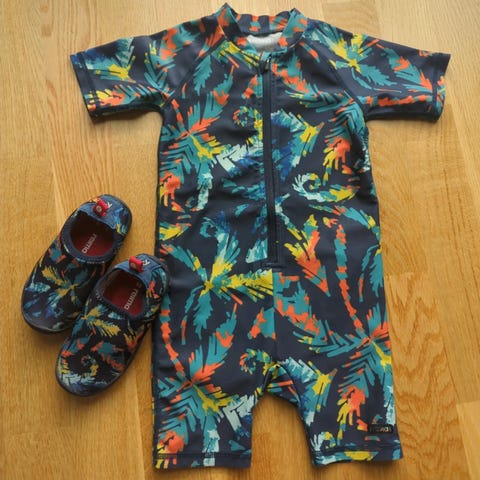 Reima UV-drakt for barn i størrelse 74 cm. Drakten har kort erme og ben, med glidelås foran. Materialet er egnet for bading og beskytter mot UV-stråler. Flerfarget mønster med marineblå, oransje og lyse toner.