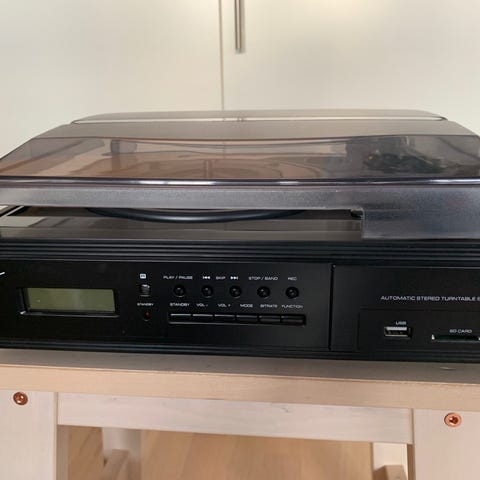 Kjøpt brukt selv, men selger videre da jeg har kjøpt en større spiller. Usikker på om platespilleren fungerer optimalt,mulig at stifter må byttes. Har radio, cd-spiller i tillegg til små vinylplater. Fin, pastellfarge turkis/grønn. Vintage/retro look.