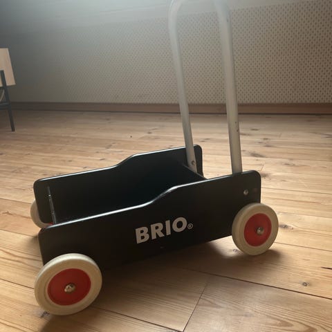 BRIO gåvogn. Barnevognen har svart kropp med hvit håndtak og røde hjul. Passer for barn til lek og utvikling av motorisk
