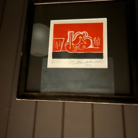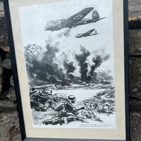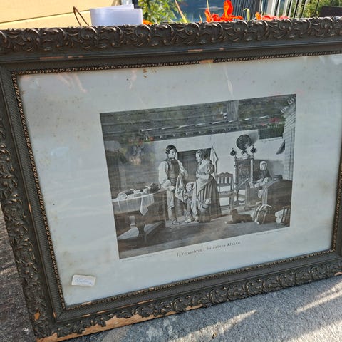 Slitasje, misfarging og patina i trykket, samt bruksspor på ramme. Selges som historisk objekt / dekor, ikke som feilfritt samlerobjekt.