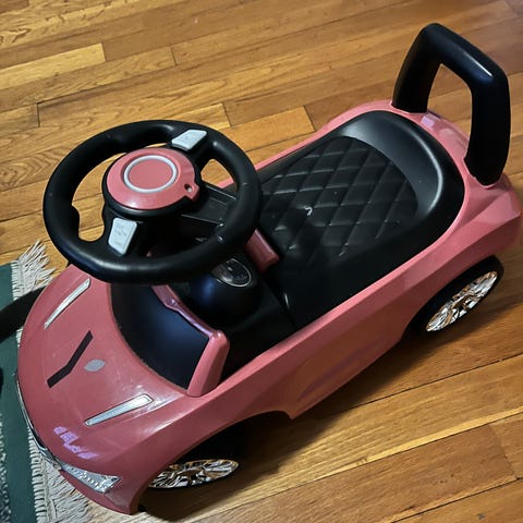 Baby Born lekebil i rød farge. Laget av plastmateriale, egnet for barn. Designet som en liten bil med ratt, sete og oppbevaringsrom under setet.