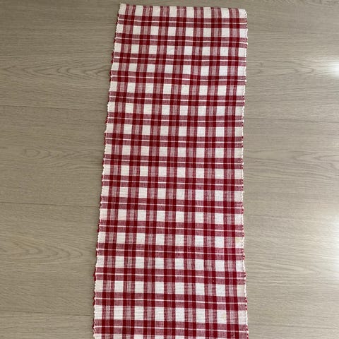 Selger en flott rutete bordløper i røde og oransje toner med innslag av hvitt og rosa – perfekt for å skape en lun og koselig stemning på bordet.