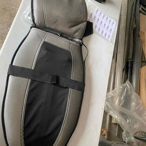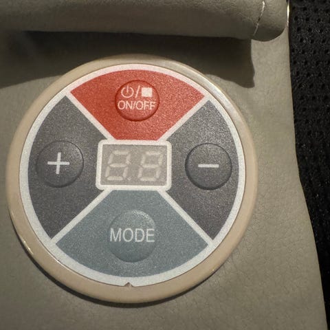 Beurer MG 206 massasjesete med kontrollpanel for øvre rygg, midtre rygg og nedre rygg. Setet har et grått og svart design og er laget for bruk på stol eller sofa.