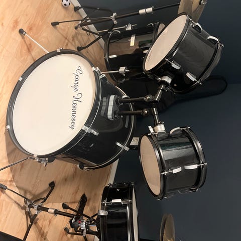 George Hennessy trommesett i svart farge. Inkluderer basstromme, skarptromme, tom-toms, gulv-tom, hi-hat, cymbaler og trommestol. Egnet for både nybegynnere og viderekomne musikere.