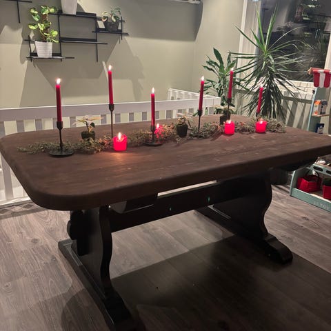 Vi har beholdt det rustikke utseende, har i romjulen pusset bordplaten og fått en enda jevnere overflate.