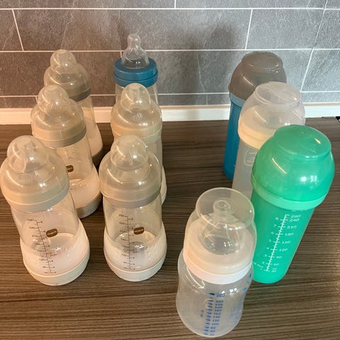 Sett med flere babyflasker i plast med ulik farge. Flaskene har smokk i silikon og måleindikatorer på siden. Passer til mating av spedbarn og småbarn.