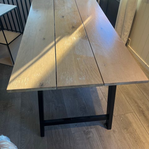 Stort, bredt spisebord med 48 cm innleggsplate. Er synlig brukt, må hentes. Leveres med bena demontert.