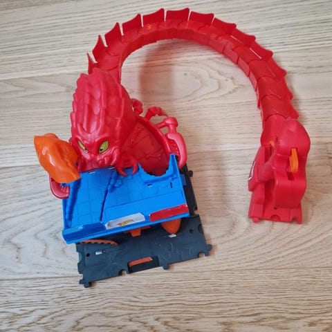 Bilbane med automatisk launcher. Banen har en loop og hopp. Alle delene er med, inkludert to småbiler som passer.