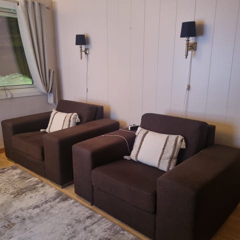 Selger to pent brukte lenestoler med pall fra Conform, modell Timeout. Stoffet er 80% ull i en grå/brun farge. Kr 5 000,- pr stol med pall. Normal bruksslitasje, men ingen hull eller annen skade. Stolene er nylig renset.