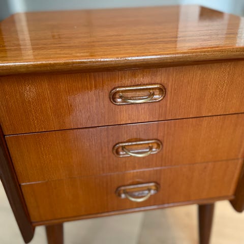 Pent stand teak nattbord med tre skuffer selger billig. Ingen synlig skader og normals bruksmerker. Ser bilder. Skuffer glir lett. Messing beslag rundt bena.