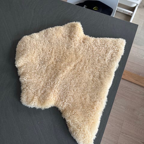 Selger så godt som ubrukt saueskinn. Kan brukes som underlag i barnevogn eller som flott pynt i stoler/på benker.