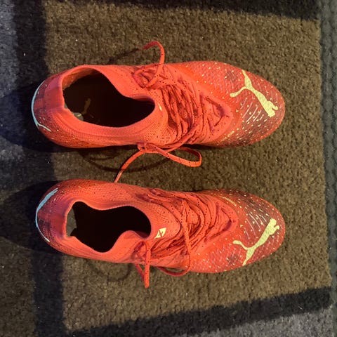 Puma Ultra 1.3 FG/AG fotballsko i oransje farge, størrelse 41. Skoene har knotter for bruk på fast og kunstgressunderlag. Materialet er lett og designet for fotballspill.