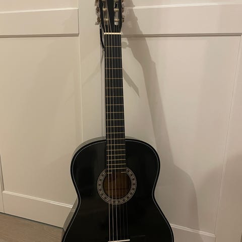 Gitaren har en treoverflate med naturlig finish og nylonstrenger.