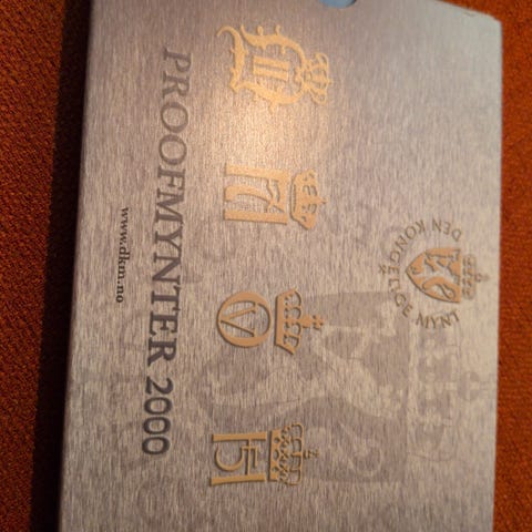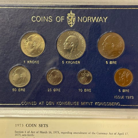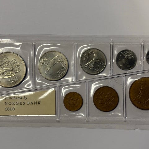 Den Kongelige Myntsett fra Kongsberg med mynter fra 1972. Settet inneholder ulike norske mynter i forskjellige størrelser og materialer, oppbevart i en plastlomme for beskyttelse og visning.