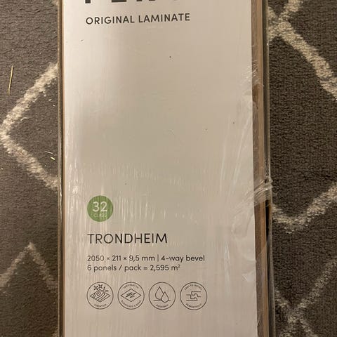 Pergo Trondheim laminatgulv med dimensjoner 2050 x 211 x 9,5 mm. Gulvplankene har 4-sidig fas og leveres i pakker med 6 planker, totalt 2,595 m² per pakke. Produktet er designet for holdbarhet og enkel montering.