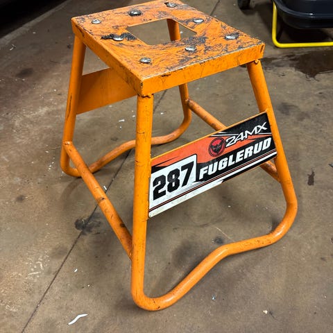 Forhjulsstøtte til MC. Brukt i henger for å transportere MC men nå demontert og klar for en ny eier. Fargen er svart, og materialet er robust metall.