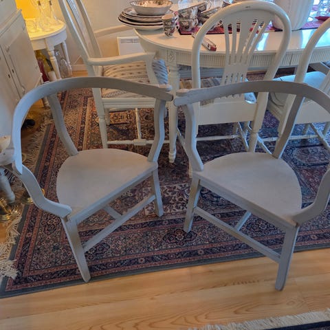 Kvalitetsstoler i black wash rotting. Country style. Ny stol koster ca 5900,-/ 435 pund. Som vist på bildene er det noe slitasje, som enkelt kan fikses med litt farge/tusj/maling. Ellers ingen slitasje eller ødeleggelse. Prisen er pr stk. Putene kan følge med, de vil bli vasket, men evt rens må selv påkostes.