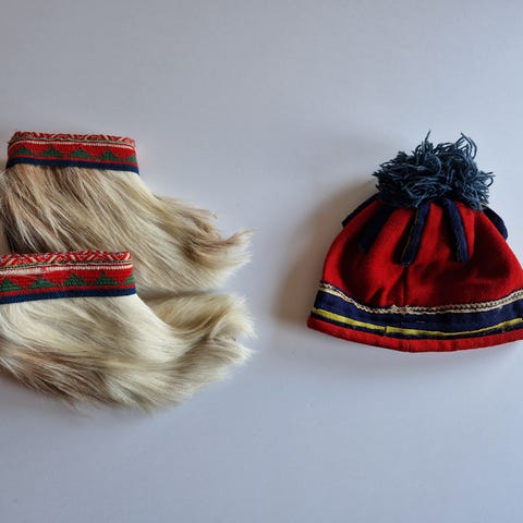 Dekorativ og særegen veske/pose laget av ekte reinsdyrskinn, med tradisjonelle vevde bånd og flettet bærestropp i klare farger. Vesken har et tydelig samisk-inspirert uttrykk og fremstår som et solid håndverksprodukt med flott patina.