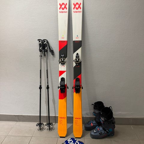 Selger et samlet oppsett for topptur og frikjøring. Utstyret er brukt i noen sesonger, men består av solide kvalitetskomponenter som fungerer godt sammen.